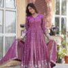 The gown features luxurious foil embroidery with zari and sequins work, enhancing its rich and festive look. Tailored with a flattering fancy V-neck and full sleeves, it offers a perfect blend of tradition and trend. With a generous 3.5-meter flair and full cotton lining from top to bottom, it ensures comfort along with grandeur.
