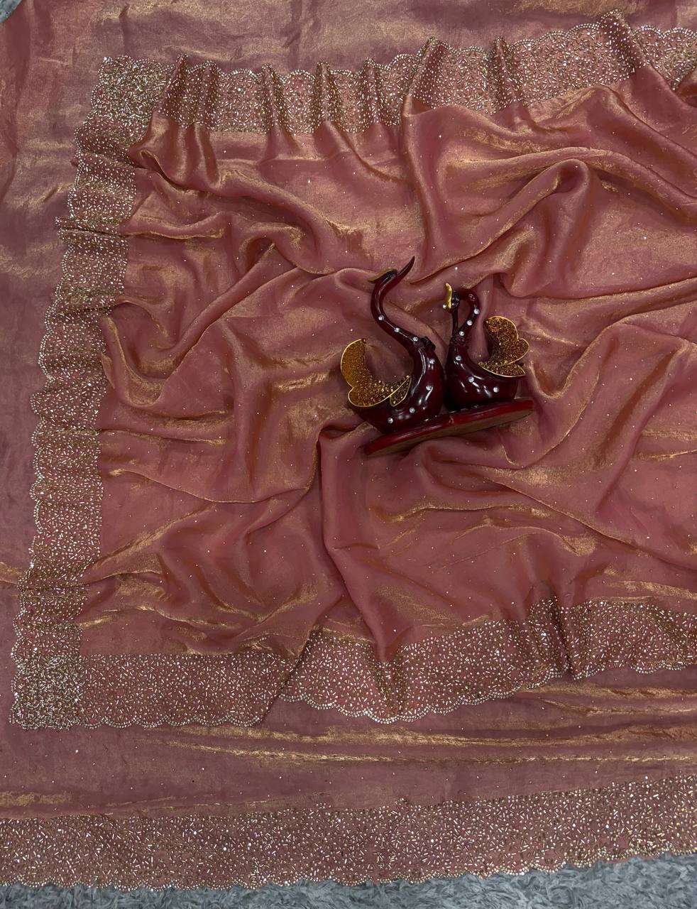Capture a moment in time with Design No. NC – 5434, a breathtaking saree crafted from luxurious Space Silk. This exquisite piece features original Jarkhan Diamond work delicately handcrafted throughout the saree, creating a dazzling effect reminiscent of a million stars in the sublime sky. The vibrant pink hue is beautifully complemented by this intricate embellishment. It comes complete with a matching blouse in Space Silk Fabric, also adorned with beautiful Jarkhan Diamond work. This radiant ensemble is available for ₹6,399.00.